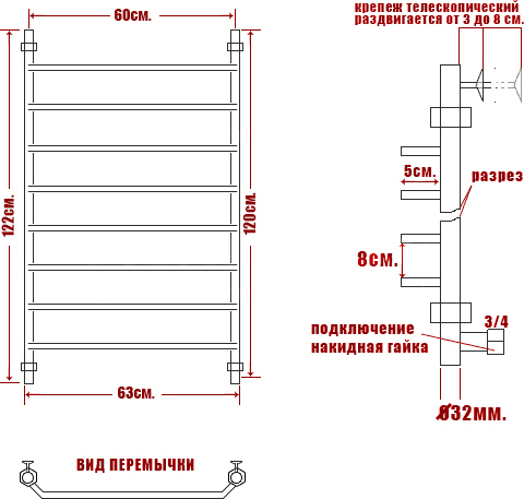- Наружный диаметр основной трубы/перекладин: 32 / 18 мм.
