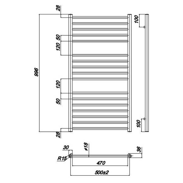 Водяной полотенцесушитель Ravak Norma 53х100 X04000083679 с нижним подключением, с 13 перекладинами изготовлен из нержавеющей стали.