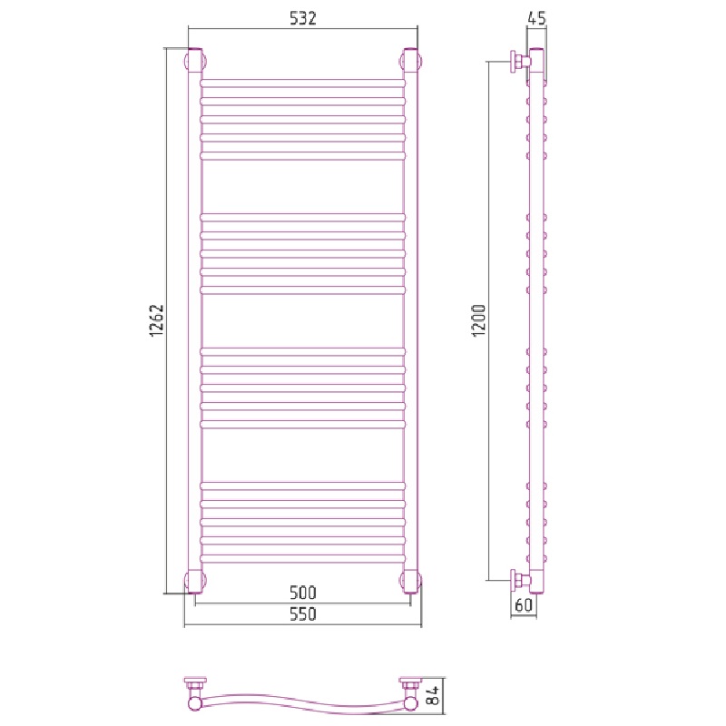 - Внешние габариты (высота х ширина х глубина) (мм): 1262х550х84,