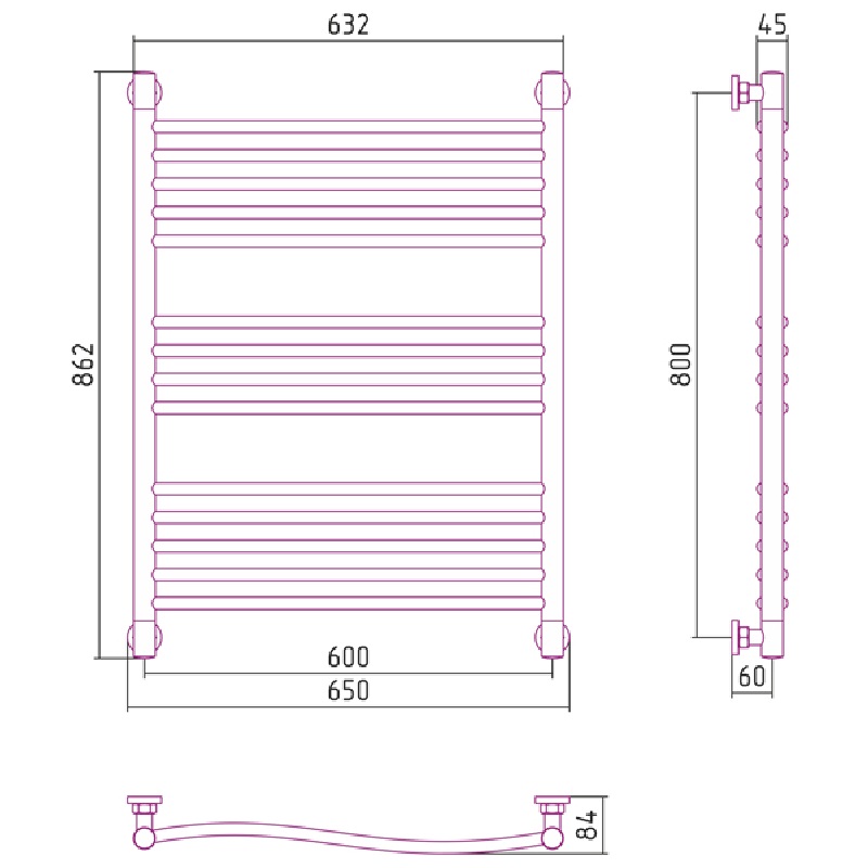 Технические характеристики:- Межосевое расстояние: нижнее подключение X (мм): 600, диагональное подключение Y (мм): 800, вертикальное подключение Y (мм): 800,