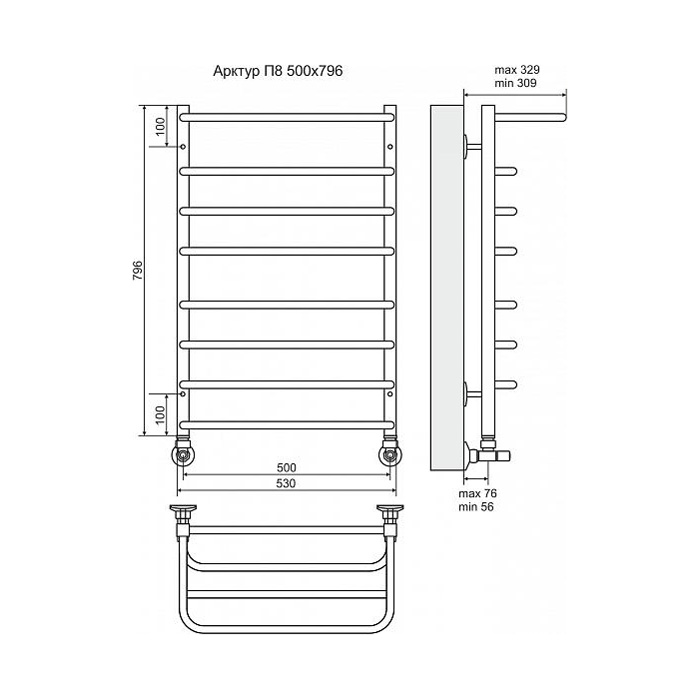 Водяной полотенцесушитель Terminus Арктур П8 500х796 4620768886430 с полкой, с нижним подключением. Для производства полотенцесушителя используется только высококачественная нержавеющая сталь марки AISI 304L с высоким содержанием легирующих элементов, Ni и Cr, это позволяет изделиям сохранять стойкость к агрессивным коррозийным средам, что существенно продлевает срок их эксплуатации. Толщина стенки используемой трубы не менее 2 мм, это обеспечивает 10-ти кратный запас прочности, труба устойчива к резким перепадам давления в системе водоснабжения!