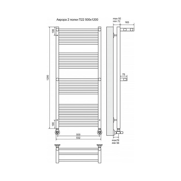 Водяной полотенцесушитель Terminus Аврора П22 500х1200 4660059582191 с полкой, с нижним подключением. Для производства полотенцесушителя используется только высококачественная нержавеющая сталь марки AISI 304L с высоким содержанием легирующих элементов, Ni и Cr, это позволяет изделиям сохранять стойкость к агрессивным коррозийным средам, что существенно продлевает срок их эксплуатации. Толщина стенки используемой трубы не менее 2 мм, это обеспечивает 10-ти кратный запас прочности, труба устойчива к резким перепадам давления в системе водоснабжения!