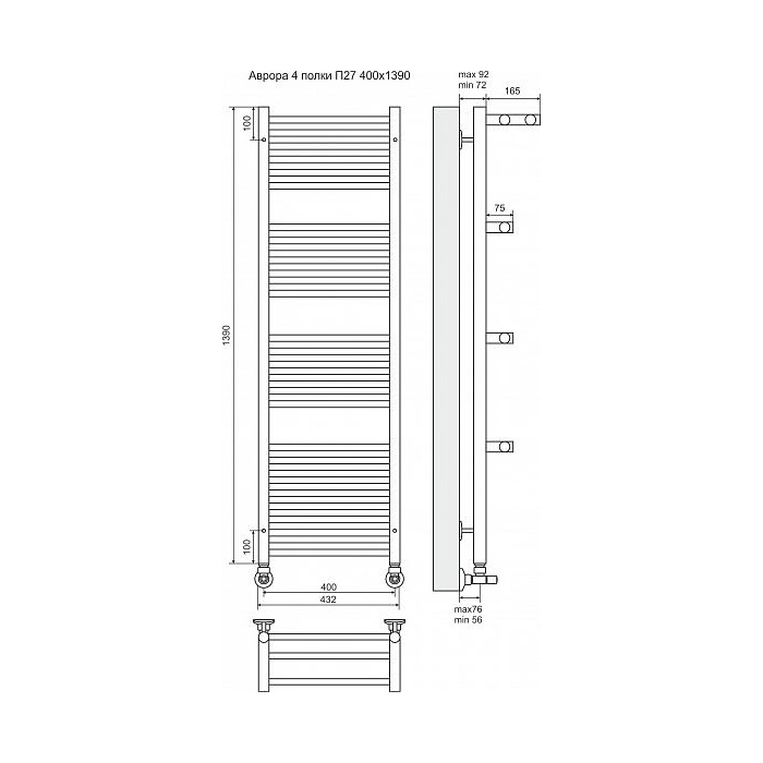 Водяной полотенцесушитель Terminus Аврора П27 400x1390 4660059582313 с полкой, с нижним подключением. Для производства полотенцесушителя используется только высококачественная нержавеющая сталь марки AISI 304L с высоким содержанием легирующих элементов, Ni и Cr, это позволяет изделиям сохранять стойкость к агрессивным коррозийным средам, что существенно продлевает срок их эксплуатации. Толщина стенки используемой трубы не менее 2 мм, это обеспечивает 10-ти кратный запас прочности, труба устойчива к резким перепадам давления в системе водоснабжения!