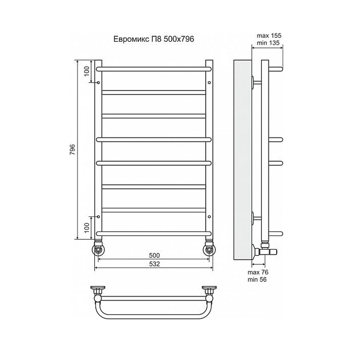 Водяной полотенцесушитель Terminus Евромикс П8 500x796 4670030723123 с нижним подключением. Для производства полотенцесушителя используется только высококачественная нержавеющая сталь марки AISI 304L с высоким содержанием легирующих элементов, Ni и Cr, это позволяет изделиям сохранять стойкость к агрессивным коррозийным средам, что существенно продлевает срок их эксплуатации. Толщина стенки используемой трубы не менее 2 мм, это обеспечивает 10-ти кратный запас прочности, труба устойчива к резким перепадам давления в системе водоснабжения!