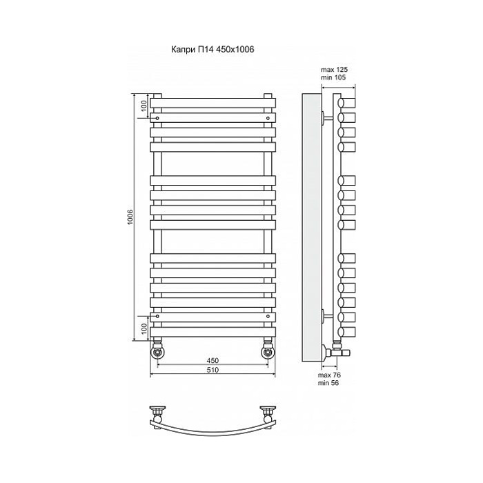 Водяной полотенцесушитель Terminus Капри П14 450x1006 4620768887185 с нижним подключением. Для производства полотенцесушителя используется только высококачественная нержавеющая сталь марки AISI 304L с высоким содержанием легирующих элементов, Ni и Cr, это позволяет изделиям сохранять стойкость к агрессивным коррозийным средам, что существенно продлевает срок их эксплуатации. Толщина стенки используемой трубы не менее 2 мм, это обеспечивает 10-ти кратный запас прочности, труба устойчива к резким перепадам давления в системе водоснабжения!