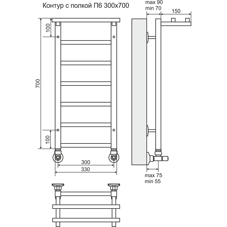 Водяной полотенцесушитель Terminus Контур П6 300х700 4660059582405 с полкой Хром
