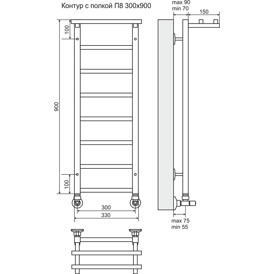 Водяной полотенцесушитель Terminus Контур П8 300х900 4660059582412 с полкой Хром