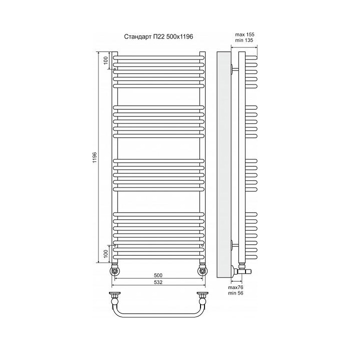 Водяной полотенцесушитель Terminus Стандарт П22 500x1196 4620768886201 с нижним подключением. Для производства полотенцесушителя используется только высококачественная нержавеющая сталь марки AISI 304L с высоким содержанием легирующих элементов, Ni и Cr, это позволяет изделиям сохранять стойкость к агрессивным коррозийным средам, что существенно продлевает срок их эксплуатации. Толщина стенки используемой трубы не менее 2 мм, это обеспечивает 10-ти кратный запас прочности, труба устойчива к резким перепадам давления в системе водоснабжения!