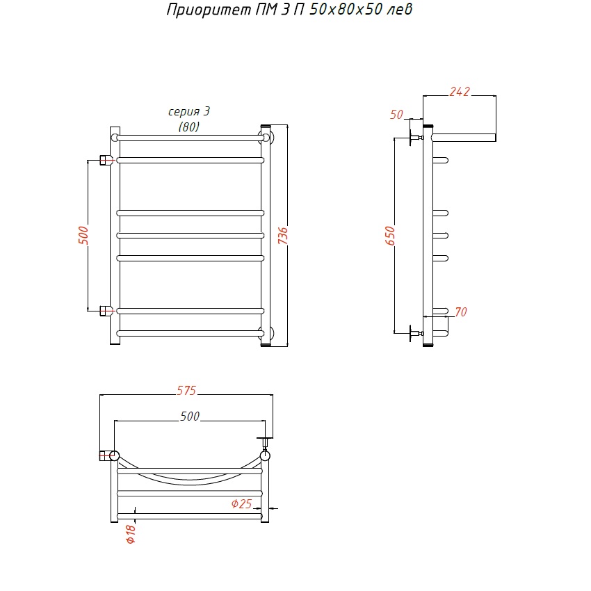 Водяной полотенцесушитель Тругор Приоритет 3 П ПМ 80x50 с полкой L Хром