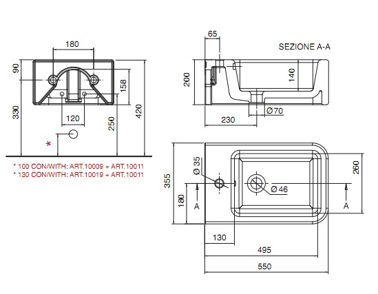 С 1 отверстием под смеситель |