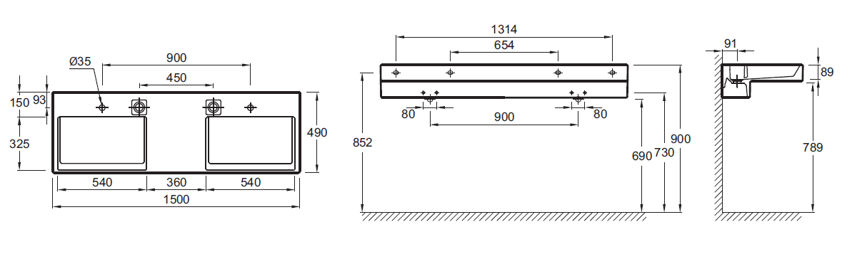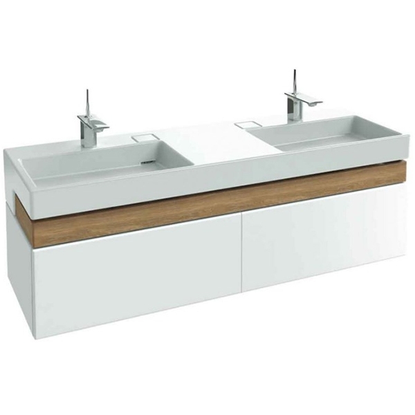 Двойная раковина Jacob Delafon Terrace 150 EXA112-00 с двумя готовыми и четырьмя намеченными отверстиями под два смесителя.