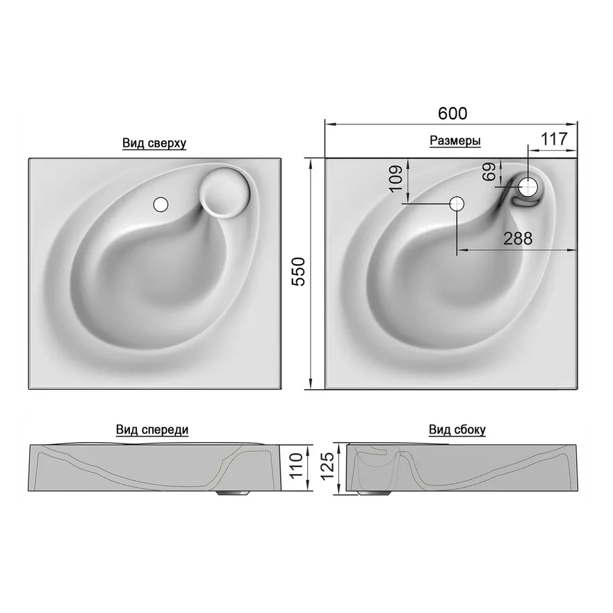 - Отверстие слива расположено в правом углу.