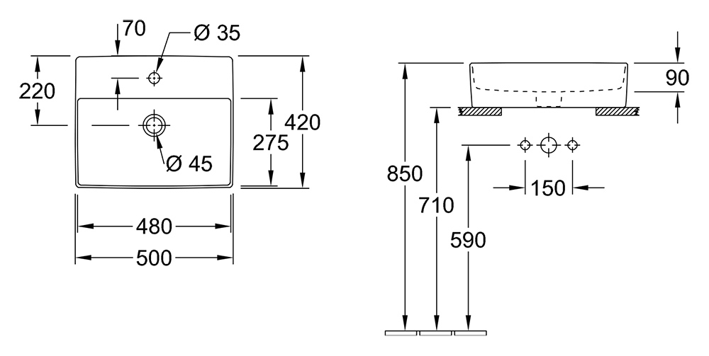 Прямоугольная раковина Villeroy&Boch Memento 2.0 50 4A075001 накладная, для установки на столешницу, с очень тонкими стенками, с переливом, с одним готовым и двумя намеченными отверстиями под смеситель.