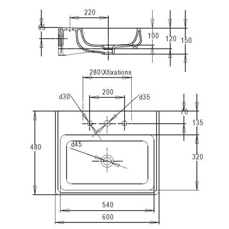- Одно готовое и два намеченных отверстия под смеситель.
