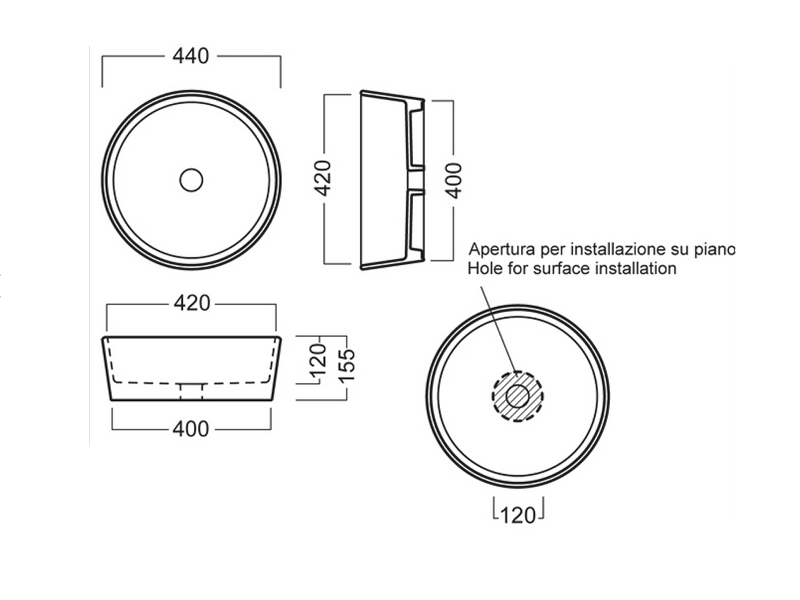 - Размер (ШхДхВ): 44 x 44 х 15,5 см. Глубина чаши: 12 см.