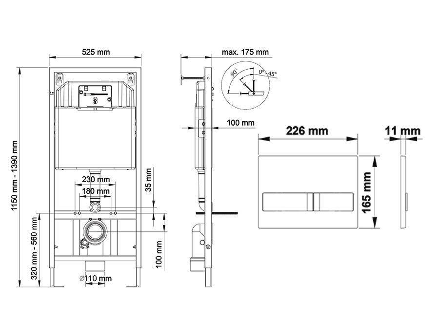 - Габариты инсталляции (ШхВ): 525 x 1150 - 1390 мм.