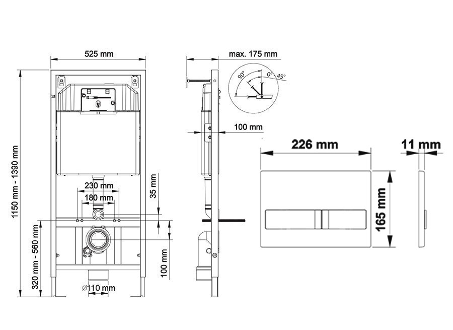 - Габариты инсталляции (ШхВ): 525 x 1150 - 1390 мм.
