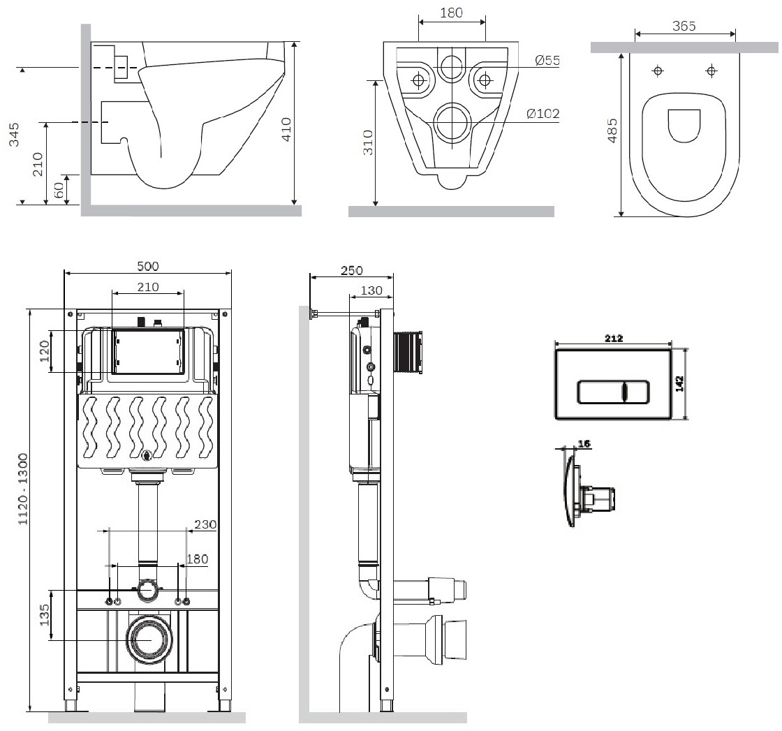 В комплекте поставки: инсталляция, унитаз, крышка-сиденье, клавиша смыва, комплект крепежей.