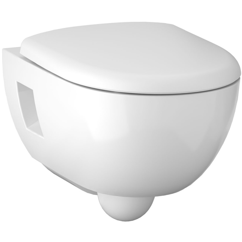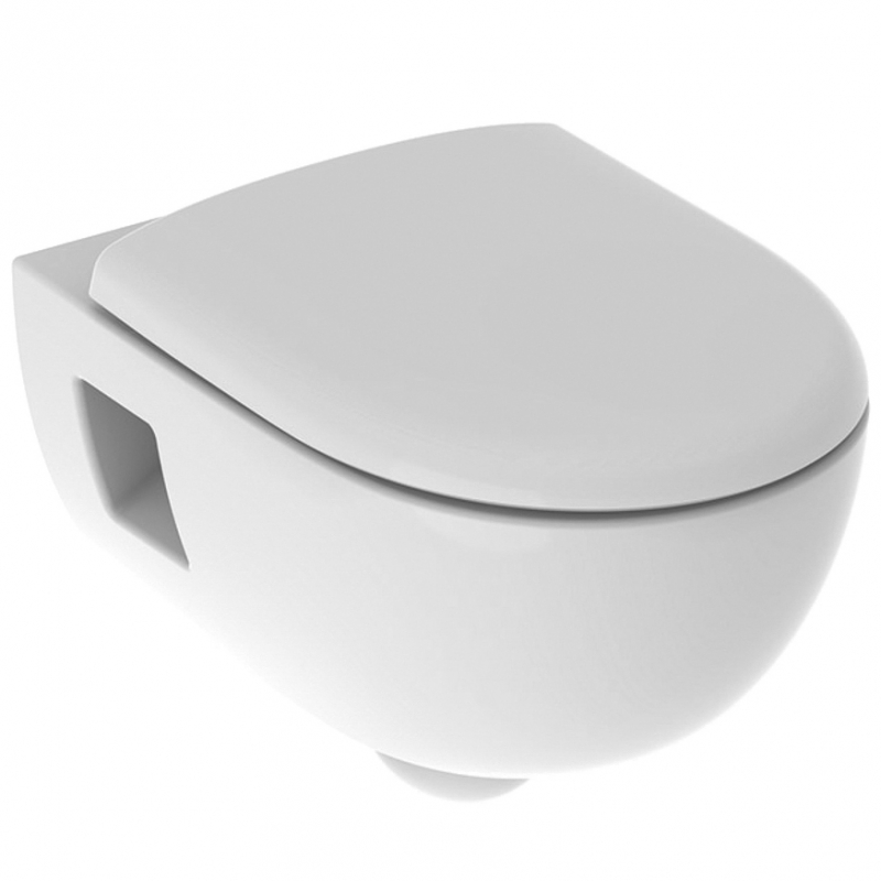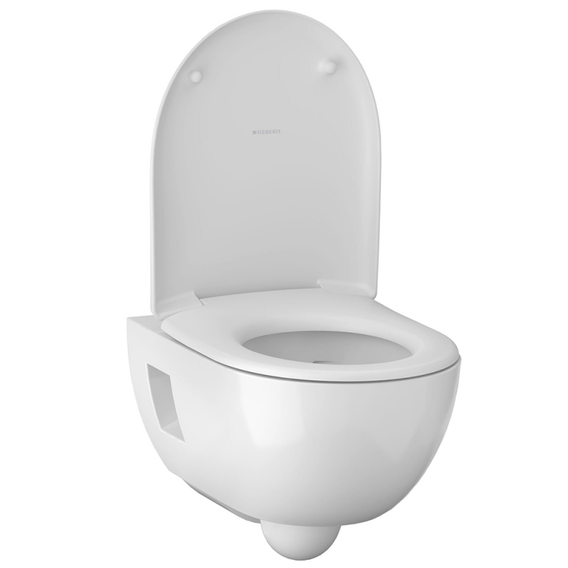 Комплект унитаза Geberit Renova 500.800.00.1 с сиденьем soft-close, инсталляцией Geberit DuofixBasic 458.103.00.1 и черной клавишей смыва 115.105.DW.1. Эффективная безободковая система смыва.