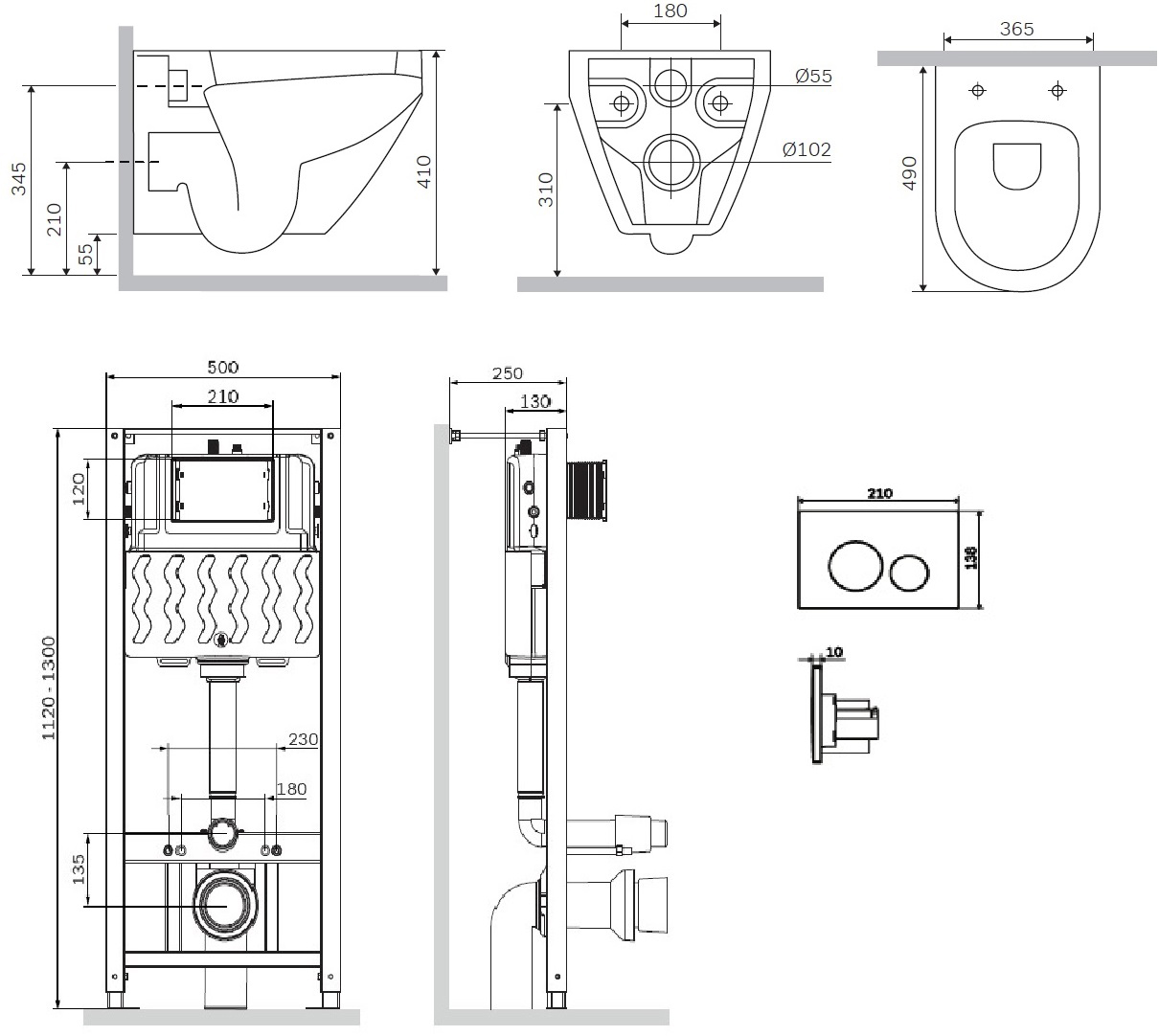В комплекте поставки: инсталляция, унитаз, крышка-сиденье, клавиша смыва, комплект крепежей.