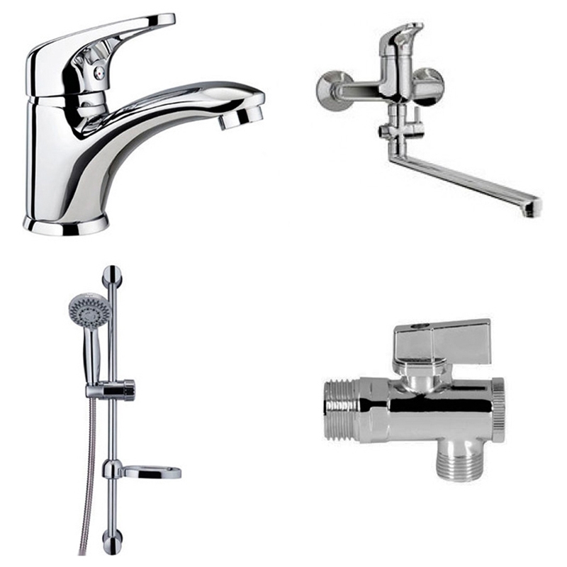 - Смеситель LB 20 для раковины - 1 шт. Смеситель AE 20 универсальный - 1 шт. Душевая лейка - 1 шт. Душевой шланг - 1 шт. Душевая стойка - 1 шт. Вентиль FKM 01-2 угловой с фильтром - 2 шт. S - образные эксцентрики - 2 шт. Инструкция - 1 шт. Смеситель TE 20 для кухни с высоким изливом - 1 шт.