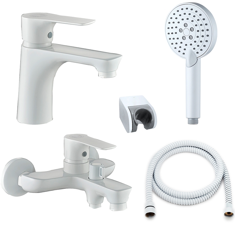 В комплекте поставки: душевой гарнитур, смеситель для ванны, смеситель для раковины, гибкая подводка.