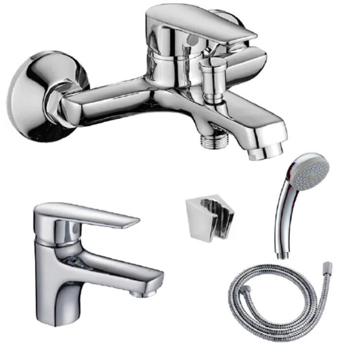 В комплекте поставки: душевой гарнитур, смеситель для ванны, смеситель для раковины, гибкая подводка.