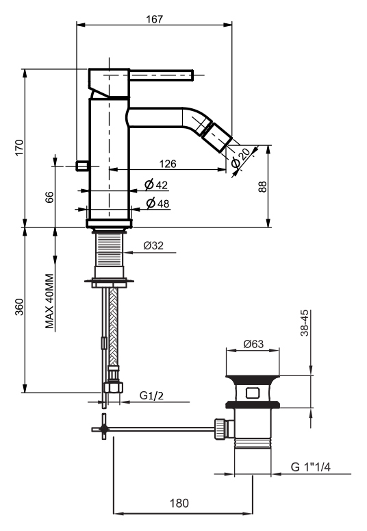 Смеситель для биде Webert Elio EL840102015 однорычажный, устанавливаемый в одно отверстие, с донным клапаном.