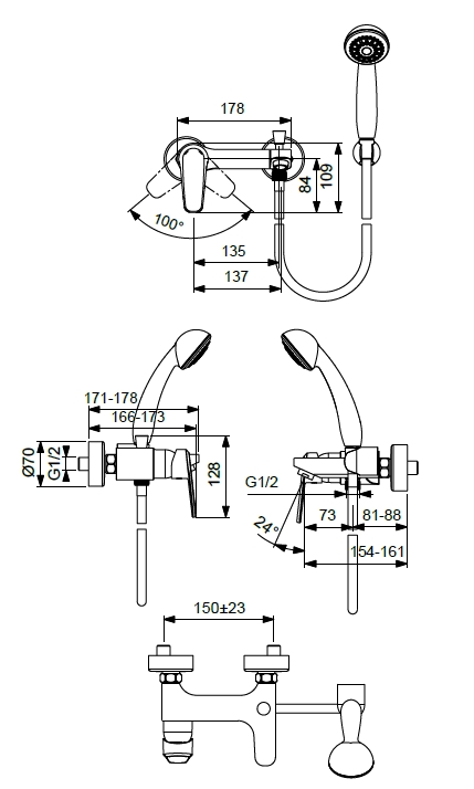 - душевой гарнитур (лейка, шланг, настенный держатель).