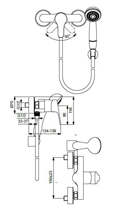 - душевой гарнитур (лейка, шланг, настенный держатель).