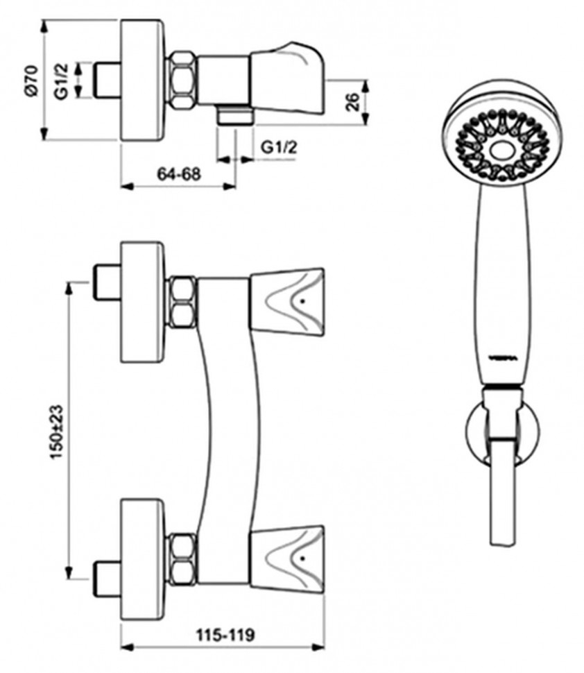- душевой гарнитур (лейка, шланг, настенный держатель).
