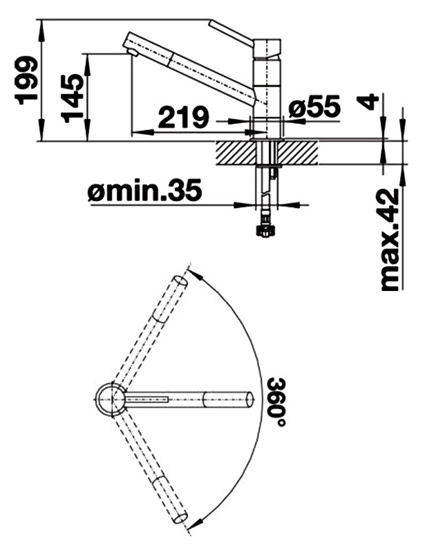 - Поворотный излив: 360 градусов, L 21,9 см.