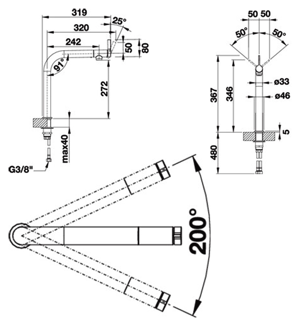 - Поворотный излив: 200 градусов, L 24,2 см.