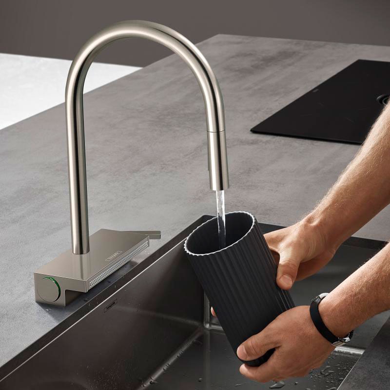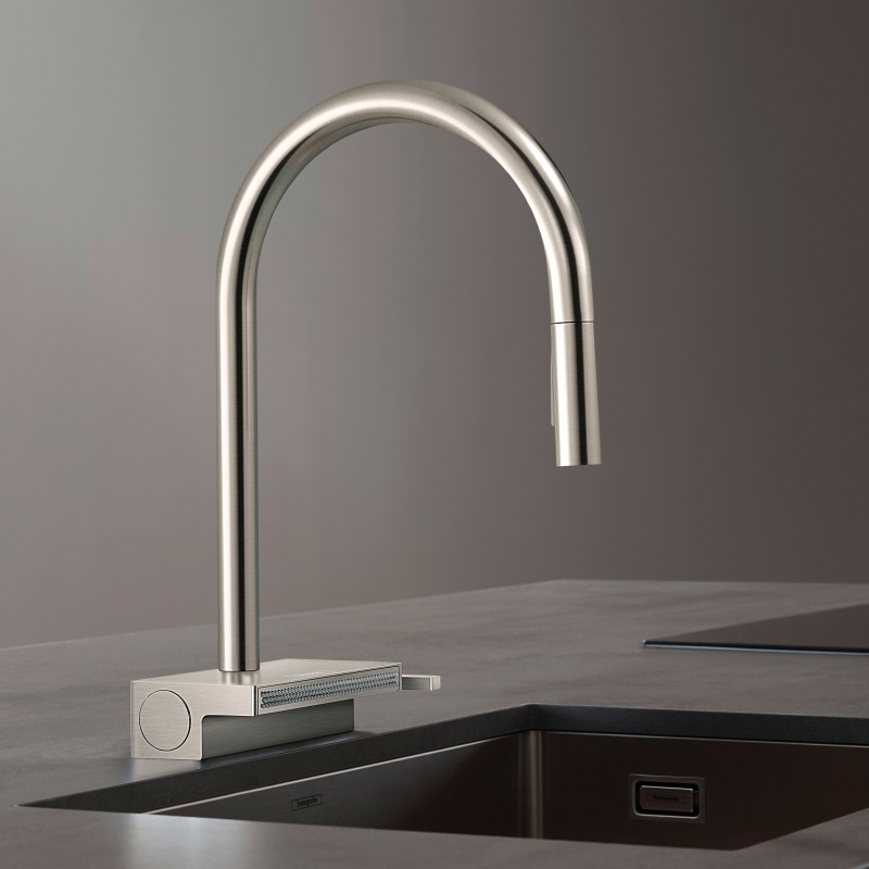 Смеситель для кухни Hansgrohe Aquno Select M81 73837800 с выдвижным изливом и дополнительным широким блоком изливом снизу, который удобно использовать для мытья овощей либо габаритной посуды. Функциональный и стильный смеситель украсит интерьер любой современной кухни.
