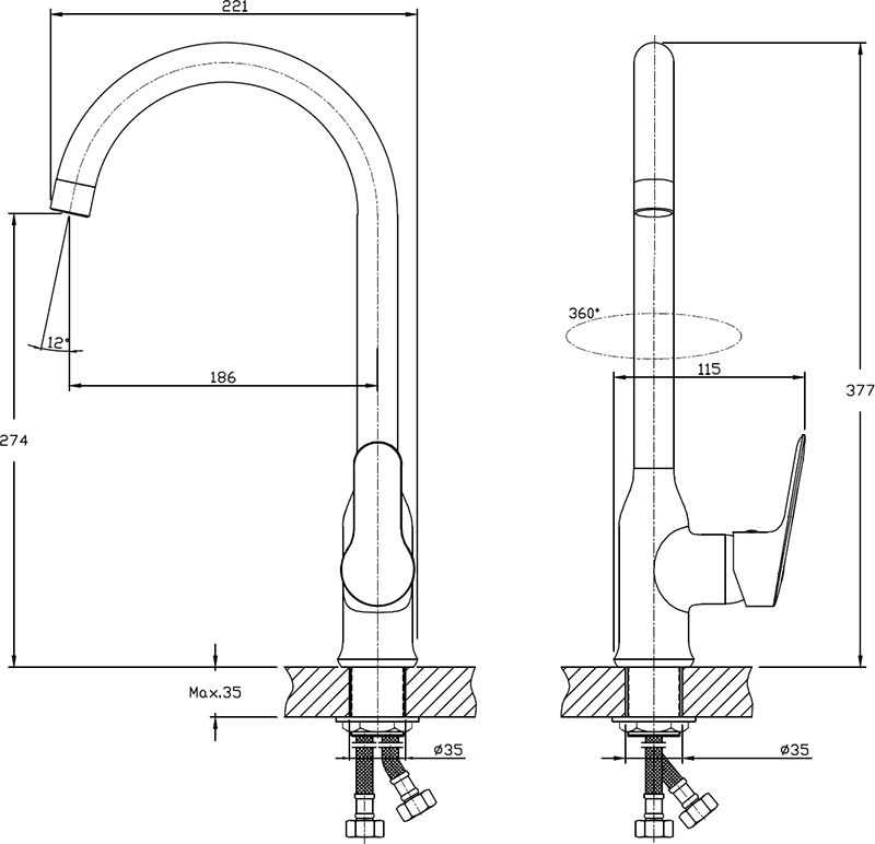 Объем поставки: смеситель для мойки, крепления, гибкая подводка (35 см), аэратор, фум-лента.