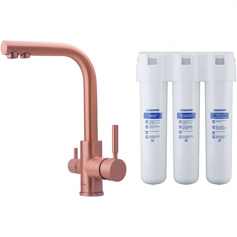 В комплекте: смеситель, комплект фильтров (Аквафор Кристалл), гибкая подводка, комплект креплений.