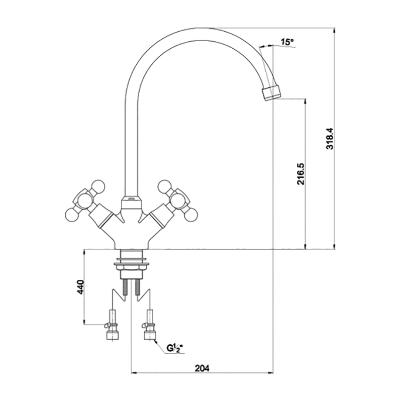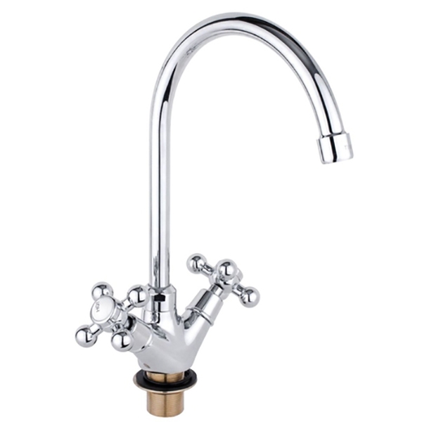 Двухвентильный смеситель с поворотным изливом. Имеет долгий срок эксплуатации за счет качественных деталей, неприхотлив в уходе. Станет прекрасным дополнением кухни.