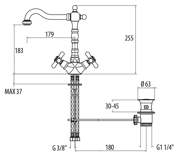 Смеситель для раковины Gattoni Versilia 10300 двухвентильный, с автоматическим донным клапаном.