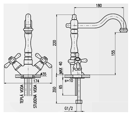 Смеситель для раковины Rav Slezak Morava retro MK520.5/8 монолитный, двухвентильный, изготовлен из высококачественной латуни, которая исключает какую-либо коррозию. Поворотный излив, 360 градусов, длиной 180 мм. Качественные керамические кран буксы, гарантируют долговечность и мягкий поток воды, производство Германия. Гибкая подводка G1/2, длиной 350 мм. В комплекте смеситель, гибкая подводка и крепления.