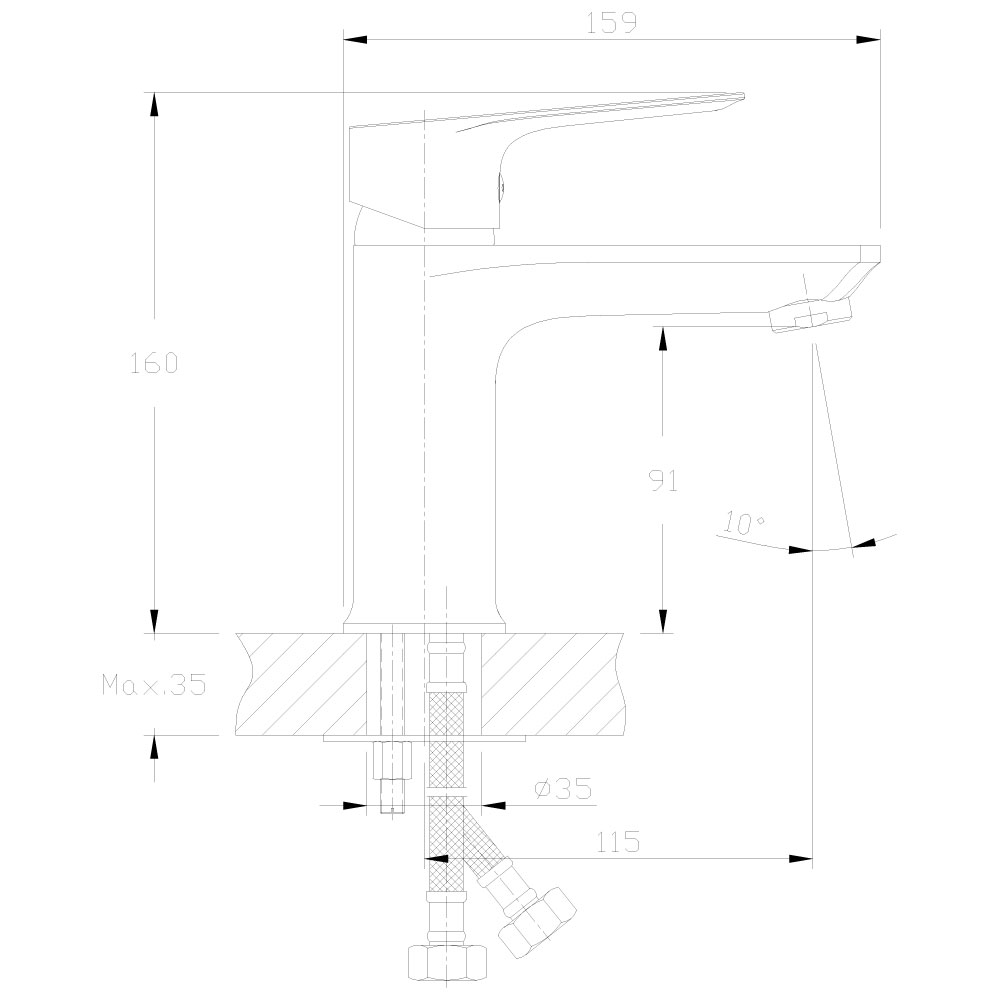 Смеситель для раковины Rossinka RS27-11 монолитный. Пластиковый аэратор с функцией легкой очистки, керамический картридж 35 мм, гибкая подводка 40 см - 2 шт., присоединительная группа для горизонтального крепления, металлическая рукоятка