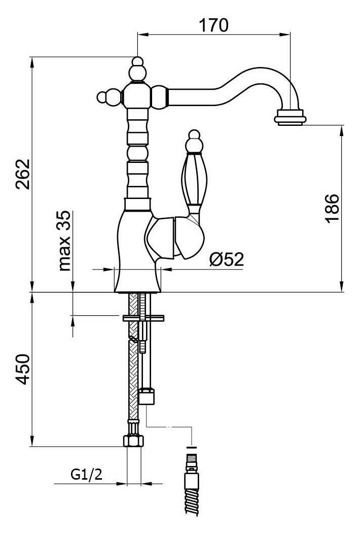 - Гибкая подводка G1/2 из нержавеющей стали длиной 37 см.