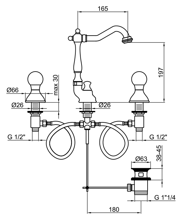 Смеситель для раковины Webert Karenina KA750202015 двухвентильный, с ручками украшенными кристаллами Swarovski, устанавливаемый в три отверстия, с донным клапаном.