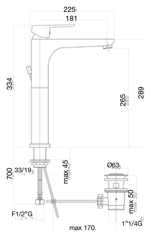 - Подключение: гибкая подводка G 1/2, длиной 70 см.