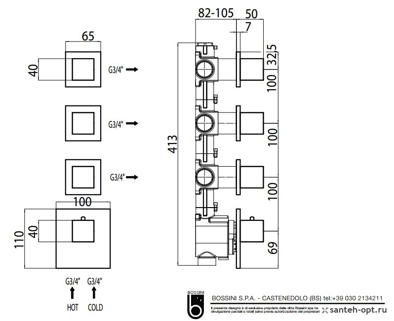 Смеситель для душа Bossini Cube Outlets Z032205.030 с термостатом. Выполнен в виде отдельных панелей с возможностью вертикальной или горизонтальной установки.