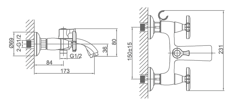 Смеситель для ванны D&K Goethe Hessen DA1383241 с коротким изливом и душевым гарнитуром, двухзахватный, на два отверстия для монтажа.