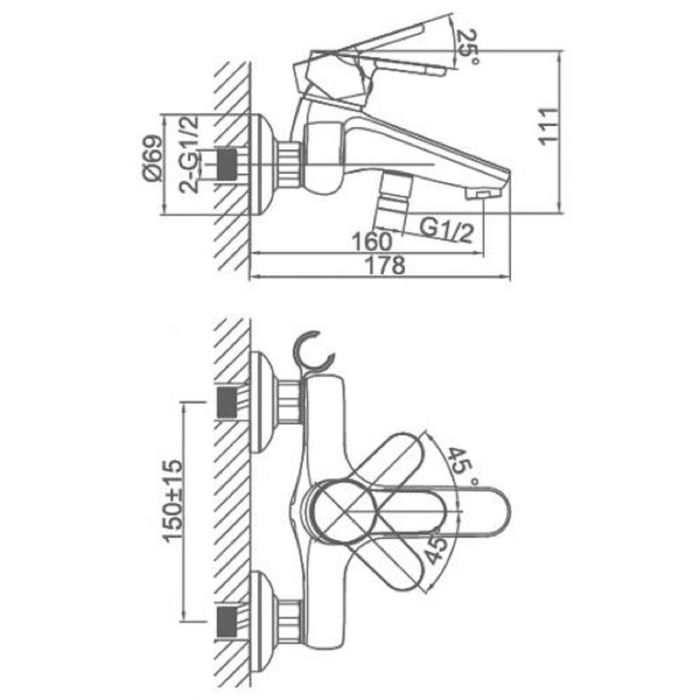 Смеситель для ванны D&K Marx Rhein DA1393201 однорычажный, с коротким изливом и душевым гарнитуром, на два отверстия для монтажа.