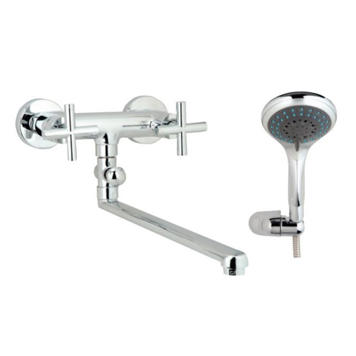Универсальный смеситель в цвете хром, крепится на стену в 2 отверстия. Современный дизайн смесителя подойдет для любой ванной комнаты. Качественные материалы, которые используются в изготовлении смесителя, обеспечат надежность и долговечность на протяжении всего срока эксплуатации. Длинный излив смесителя позволит наполнять как ванну, так и раковину.