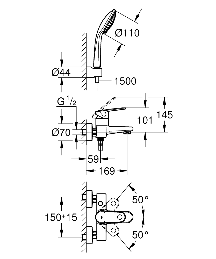 - Душевой гарнитур: ручной душ, душевой шланг длиной 150 см, настенный держатель.