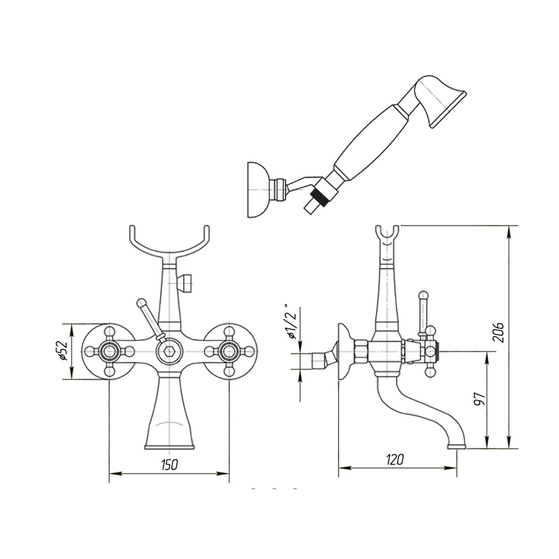 - Душевой гарнитур: ручной душ, металлический шланг, настенный регулируемый держатель.