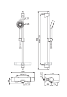 В комплекте поставки: смеситель, душевой гарнитур (лейка, штанга, шланг, держатель лейки, мыльница).